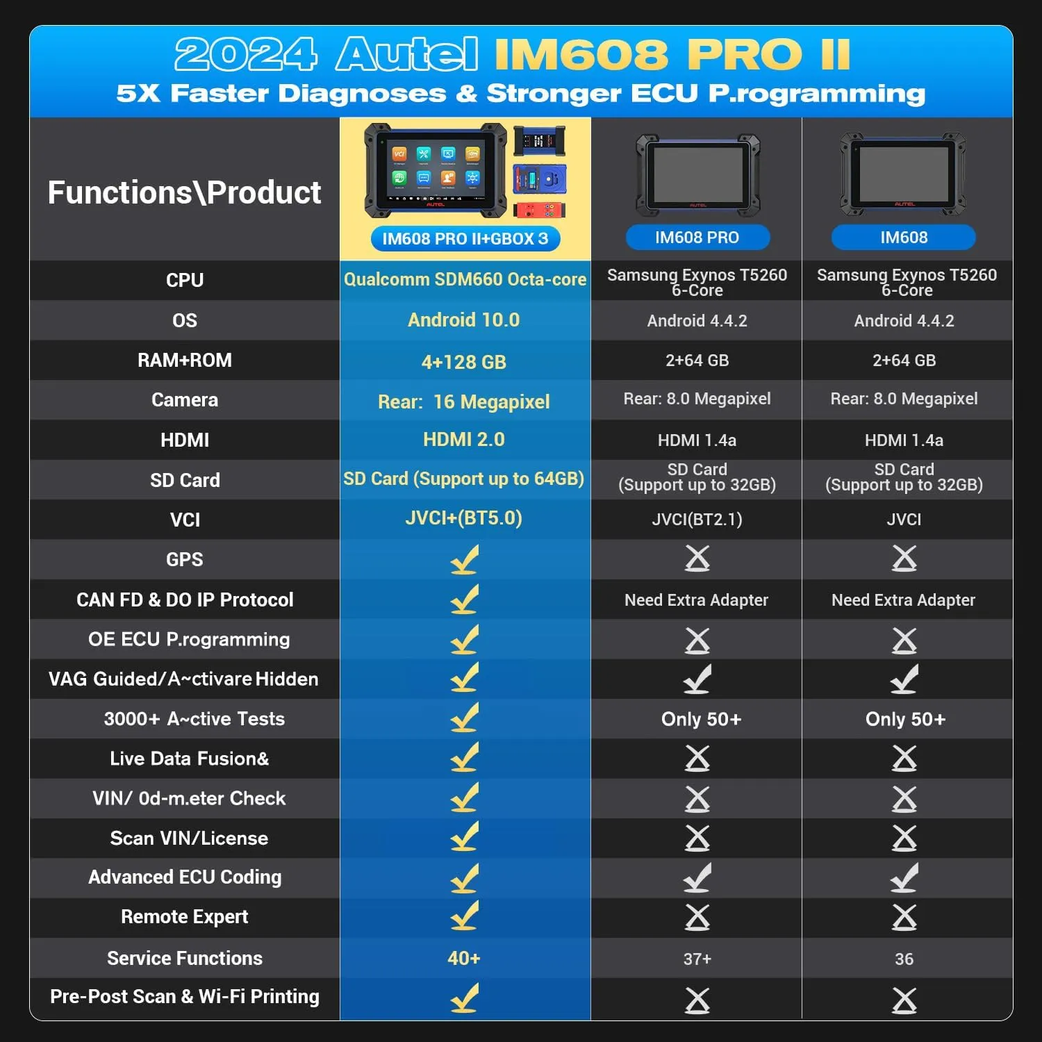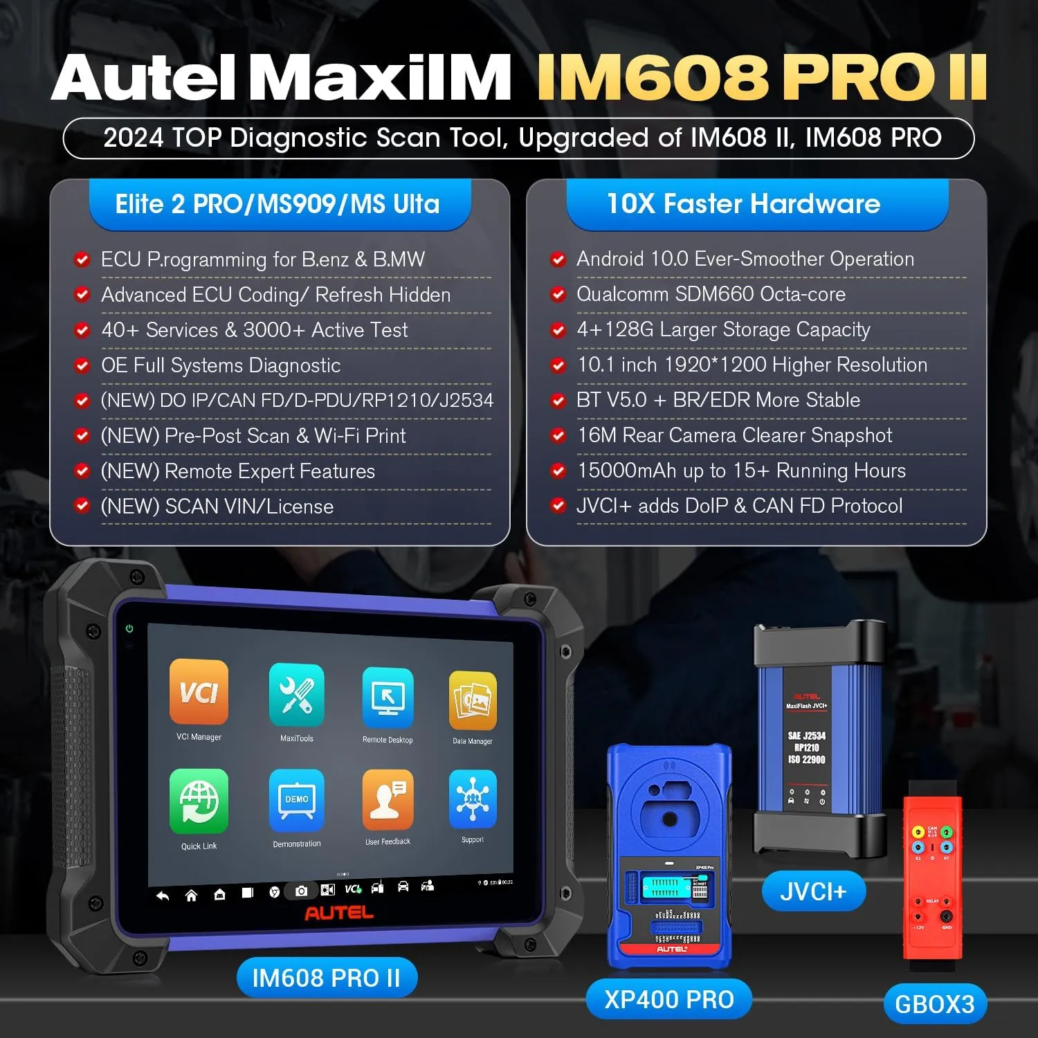 - Autel IM608 (Pro) II has improved firmware, Android 10, larger RAM, and ROM, with new JVCI+ VCI.